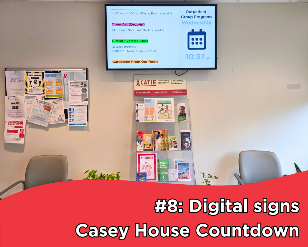 We’ve blasted into the 21st century with eight new digital signs located across the hospital. We make use of these revitalized displays to showcase programs, infection, prevention and control messaging, service disruptions, lovely images of the building as well as Casey House throwback photos. Waiting areas have never been so entertaining! We are always proud to share the amazing programs and services offered by our outpatient department, and encourage clients to get involved and drop in.