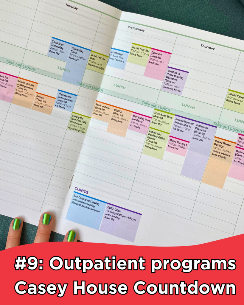 We’re pleased to offer eight outpatient groups, in addition to our midday lunch, that make Wednesdays a bit brighter! This past fall season, we had tai chi, open art drop-in, ecotherapy, circuit exercise class, then after lunch there was falls prevention, meth and me support group, bingo, and gardening. Our outpatient group programs are full of variety, from physical activities, social support groups, self-care and relaxation groups, life skills workshops, and creative activities. Our dedicated team of interdisciplinary facilitators support growth and connection for our clients every step of the way. Stay tuned for our 2025 winter programs calendar, coming soon!