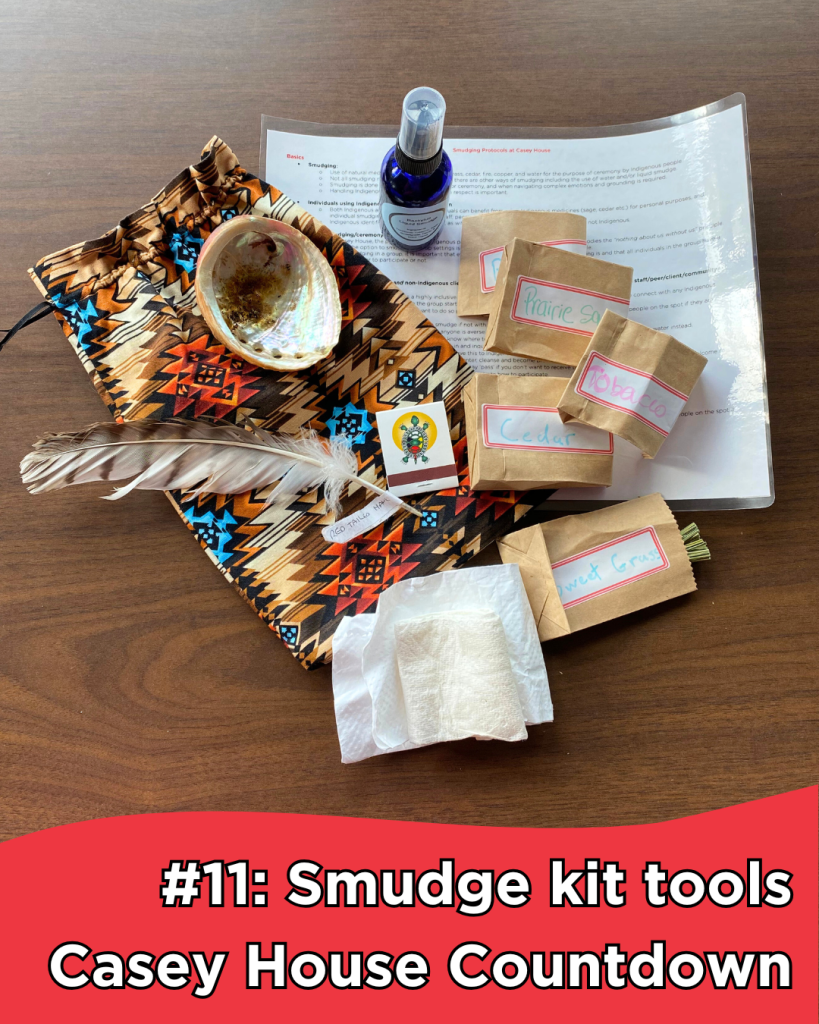 There are eleven components in the smudge kits found across multiple client spaces at Casey House: matches, an eagle feather, an abalone shell, paper towels, liquid smudge, prairie sage, tobacco, cedar, sweet grass, and a copy of instructions with several scenarios on how to facilitate smudging, all enclosed in an attractive cloth drawstring bag.