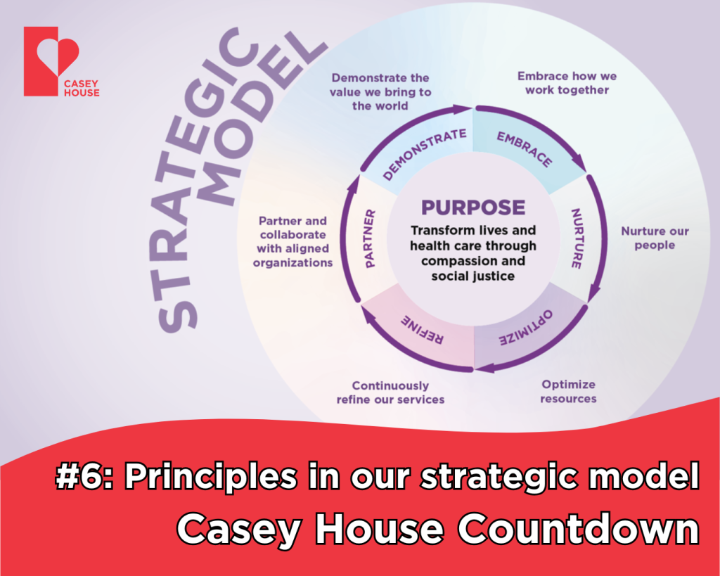 In the sixth spot, are the six principles in Casey House’s strategic model that guide our approach as a health care provider for people who have been systemically excluded from receiving care. Embrace how we work together Nurture our people Optimize resources